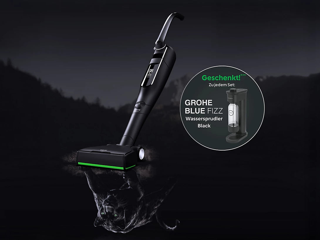 VK7 Akku-Staubsauger & Saugwischer Black (inkl. GROHE Wassersprudler): Bei Kauf dieses Sets im Aktionszeitraum 02.12.2025 bis 11.01.2026 spart man 290,80 € gegenüber der Summe der regulären Einzelpreise (inkl. 2. Akku bestehend aus BY7+CA7, i.H.v. 1.789,80 €). Zudem erhält man einen GROHE Blue Fizz Wassersprudler, Starter Set (1 x Trinkflasche, 1 x CO₂ Flasche) geschenkt. Gilt nicht für (teilweise) widerrufene oder stornierte Aufträge. Nur solange der Vorrat reicht.
